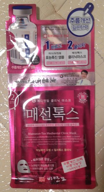 This is the real reason why I bought it. It says: Maeseon-Tox Mediental Clinic Mask. I hope this will detox my skin so I'll stop breaking out and maybe it'll help heal some of my scars and pock marks. I think the pock marks are not going to go away, except with time, but maybe the scars from the acne will get better.